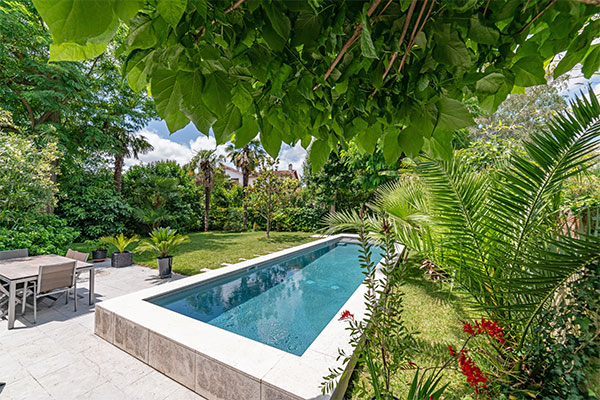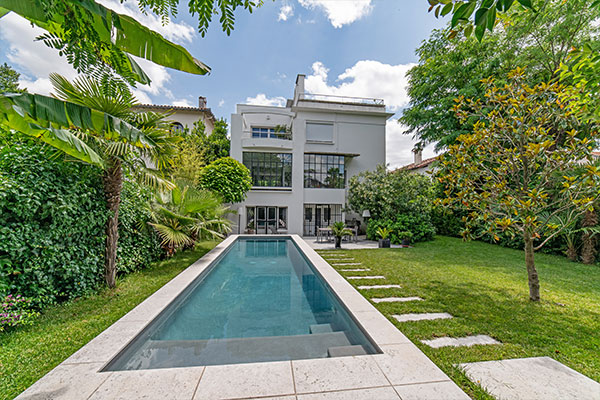 Ce couloir de nage est parfaitement intégré à l’architecture de cette maison d’architecte de style Art Déco datant de 1932, rénovée par l’architecte Fred Naulin de Craft architecture (Toulouse). D’abord, le style bassin surélevé, avec un habillage des margelles et des plages en pierres beiges de la même teinte que les façades de la maison en font une réalisation harmonieuse, comme si l’ensemble avait été construit en même temps. Ensuite, une attention toute particulière a été portée sur le choix de la couleur du bassin. Le gris, revêtement moderne et tendance en 2022, est mis en valeur par les margelles très claires. L’ensemble se veut minéral et contemporain comme pour mieux s’harmoniser avec la décoration intérieure de la maison.