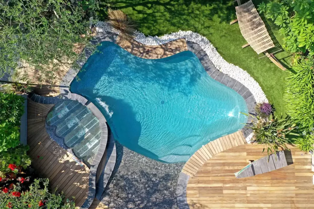 Petite piscine sur-mesure avec bords naturel et de couleur vert d’eau
