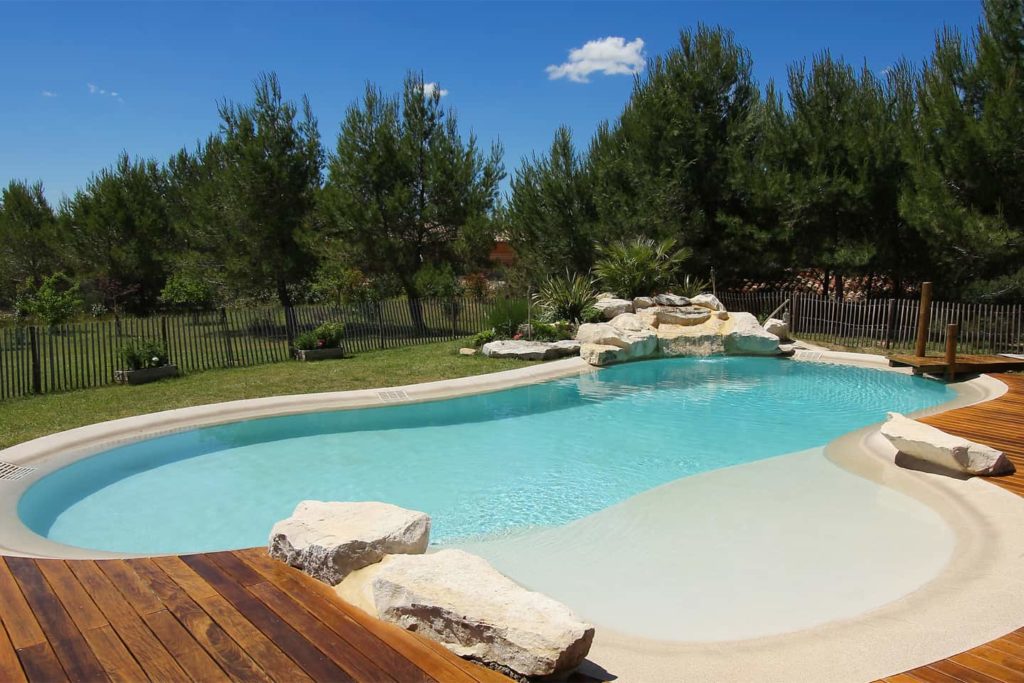 - Pour les grands terrains : si vous disposez d’un espace conséquent, profitez-en pour intégrer une plage immergée généreuse, parfaite pour accueillir plusieurs utilisateurs en même temps. Vous pourriez envisager une transition douce entre la plage et une zone de nage plus profonde, ou encore inclure un escalier large qui invite à la détente.